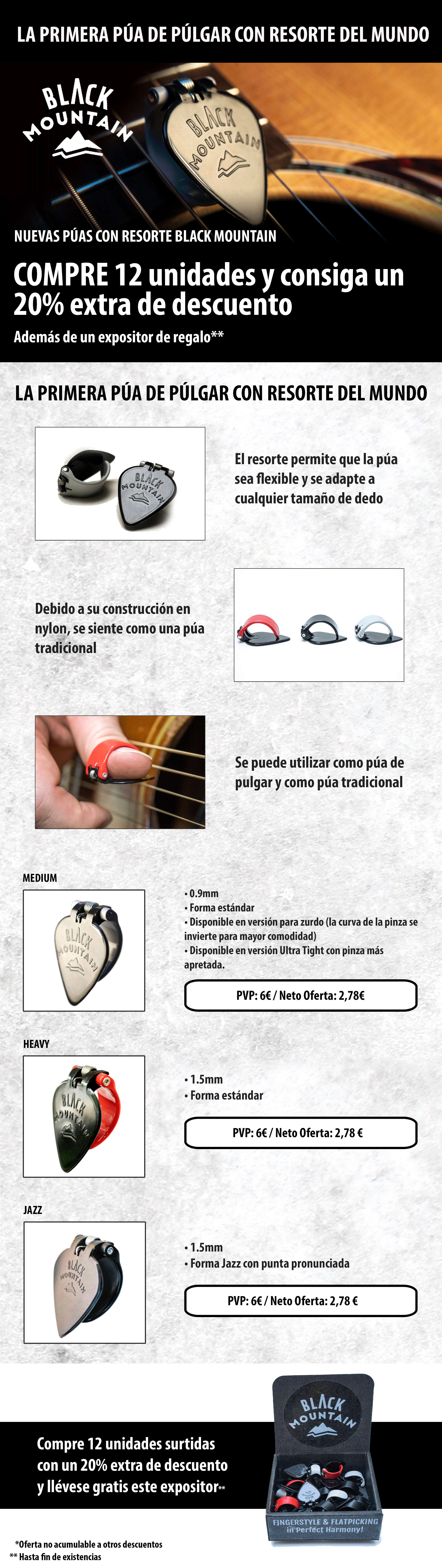¡Pidanos 12 púas Black Mountain, le hacemos un 20% de descuento extra y le regalamos un expositor!